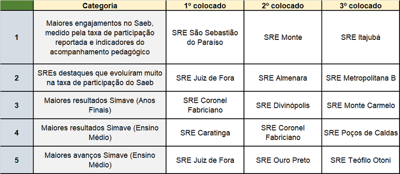 Foram premiadas as SREs que tiveram os maiores engajamentos no Sistema de Avaliação da Educação Básica (Saeb) e que tiveram os maiores resultados no Sistema Mineiro de Avaliação e Equidade da Educação Pública (Simave).